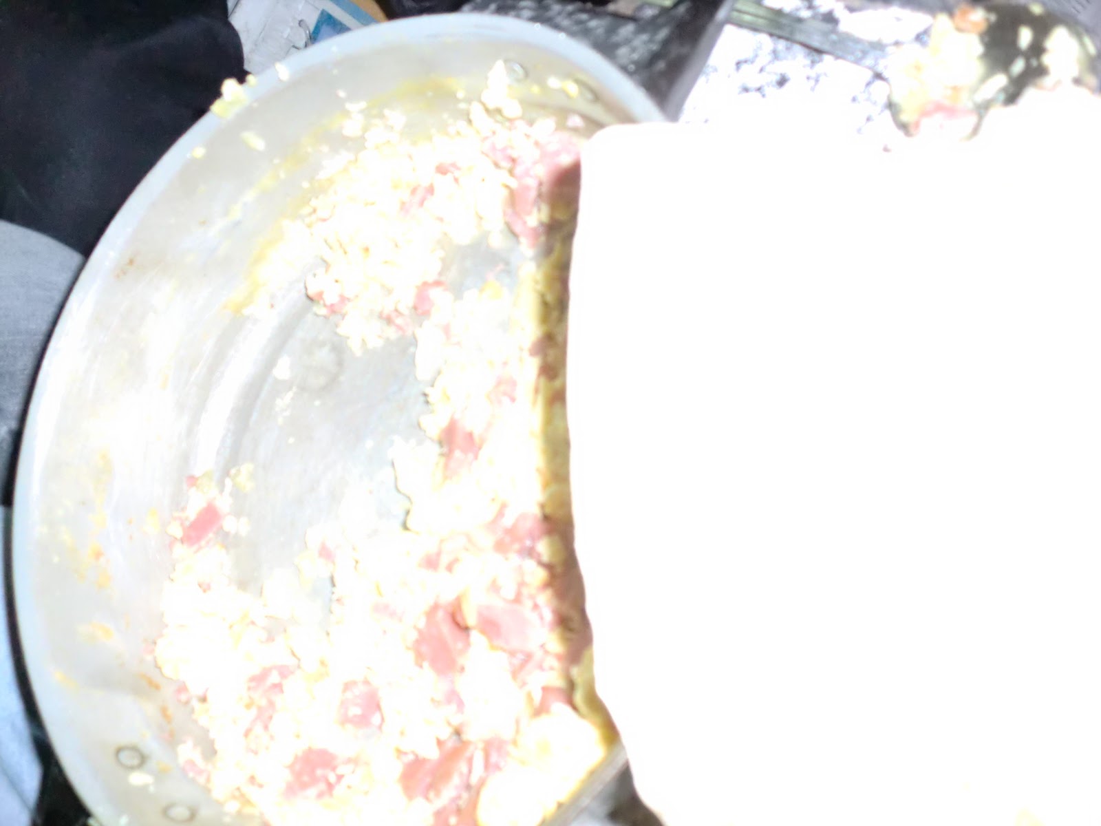シリアの家庭料理で卵とソーセージのスライスとトマトを塩コショウで炒めたもの。 パンにのせて食べます。 |