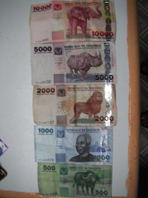 タンザニア紙幣!1000シリングだけ動物じゃないのね! 現在500シリング=30円 |